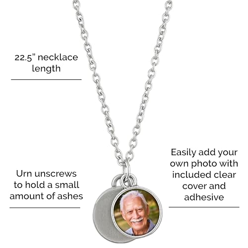 This memorial necklace with miniature photo charm and stainless steel urn is a unique tribute to the memory of a lost loved one. This special necklace is adorned with a small photo charm for adding your own cherished photo and a 1/2" stainless steel urn charm. Urn charm unscrews to reveal an opening that can securely hold a small amount of ashes to hold close to your heart. Pendant and urn hang from 22.5" necklace chain with lobster clasp. Everything you need to add your own photo to the charm is included with your purchase.
